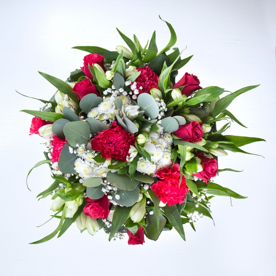 Introducing our Opulent Red and White Bloom Bouquet, a symbol of sophistication and charm. This luxurious arrangement features rich red roses and carnations, complemented by sweet white chrysanthemums and gypsophila, all elegantly arranged with white alstroemeria and aspidistra leaves.