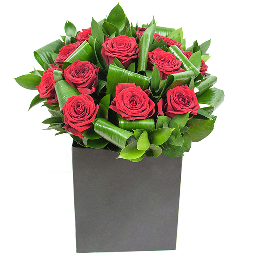Indulge in the exquisite beauty of our red rose bouquet, featuring vibrant red roses complemented by rich aspidistra leaves and graceful ruscus. This unique design brings elegance and charm to any home.